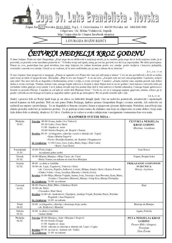 Župni listić – 4. nedjelja kroz godinu – Župa sv. Luke Evanđelista Više vijesti Gradonačelnica Novske Marija Kušmiš započela je novi mandat Izložba fotografija “Predsjednik u našem gradu” Provedite Dan obitelji u Parku prirode Lonjsko polje II. hrvatski simpozij – PRAKTIČNA PRIMJENA APITERAPIJE Župni listić – 4. vazmena nedjelja – Župa sv. Tome Apostola Rajić