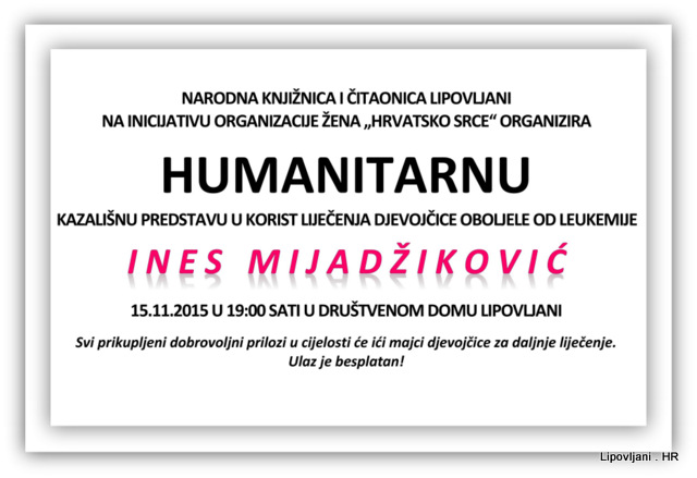 Narodna knjižnica i čitaonica Lipovljani i organizacija žena ‘Hrvatsko srce’ organiziraju humanitarnu kazališnu predstavu za potrebe liječenja 15-to godišnje djevojčice Ines Mijadžiković iz Lipovljana, oboljele od leukemije. Svi prikupljeni dobrovoljni novčani prilozi u cijelosti će biti predani majci oboljele djevojčice za potrebe daljnjeg liječenja, koja se već nalazi na liječenju u Zagrebu.