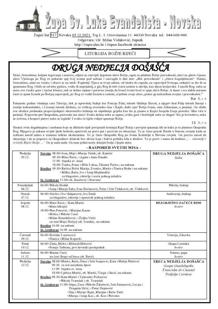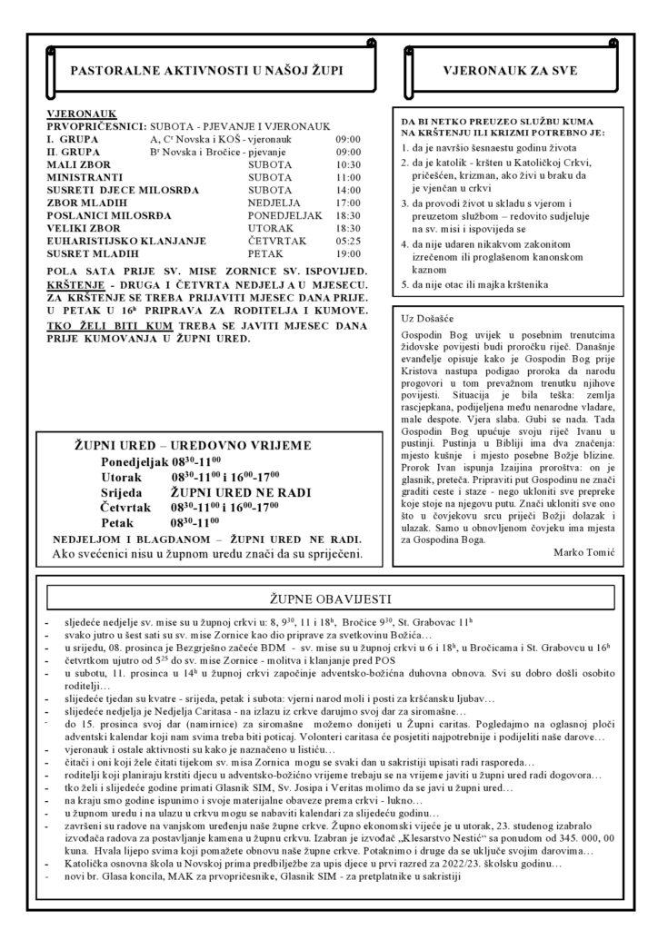 ŽUPNI LISTIĆI – Druga nedjelja došašća Više vijesti Gradonačelnica Novske Marija Kušmiš započela je novi mandat Izložba fotografija “Predsjednik u našem gradu” Provedite Dan obitelji u Parku prirode Lonjsko polje II. hrvatski simpozij – PRAKTIČNA PRIMJENA APITERAPIJE Župni listić – 4. vazmena nedjelja – Župa sv. Tome Apostola Rajić