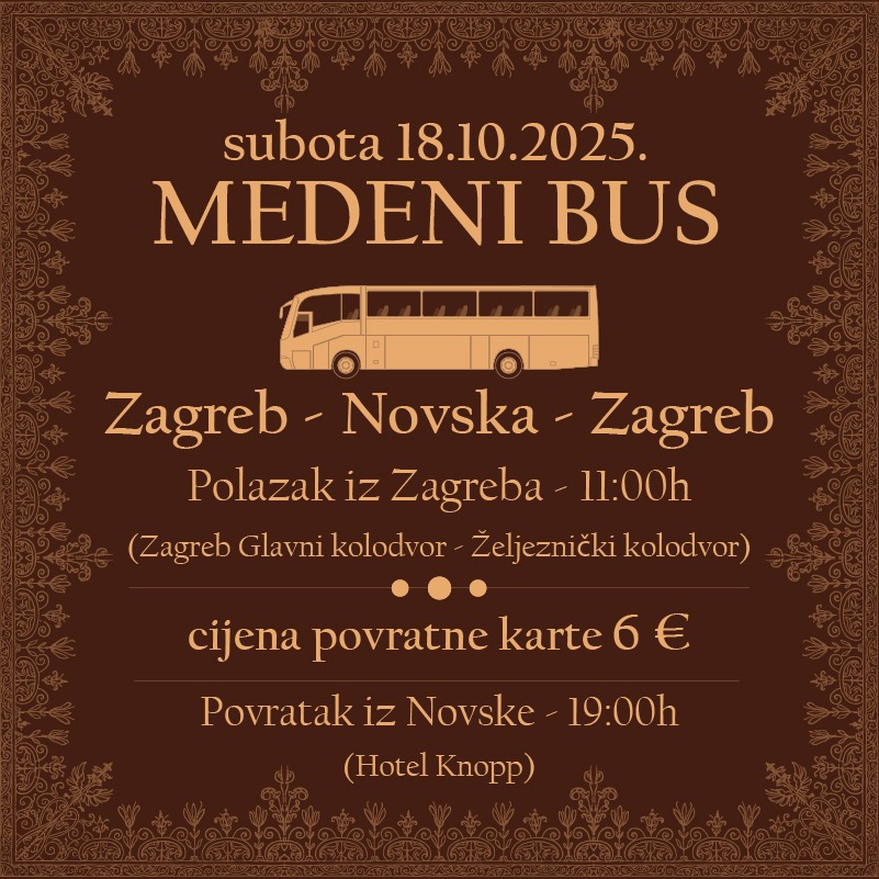Medeni bus vozi iz pravca Zagreba prema Novskoj, kreće sa Željezničkog glavnog kolodvora u subotu, 18. listopada u 11:00 sati. Povratak je isti dan, u 19:00 sati kod Hotela Knopp u Novskoj. Povratna karta iznosi 6 €, a rezervacija mjesta i sve informacije dostupne su mailom na info@novskaturist.hr.