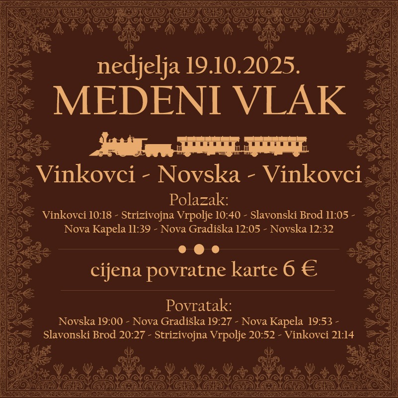 Medeni vlak vozi na relaciji Vinkovci – Novska – Vinkovci (s usputnim zaustavljanjima) i kreće u nedjelju, 19. listopada u 10:18 sati iz Vinkovaca, povratak je isti dan iz Novske u 19:00 sati te je osiguran prijevoz turističkim vlakićem do centra Novske – na jedinstveni program kirvaja Lukovo u Novskoj u gradskom parku. Povratna karta iznosi 6 €, informacije su dostupne na blagajnama, online i pozivom HŽ putničkog prijevoza.