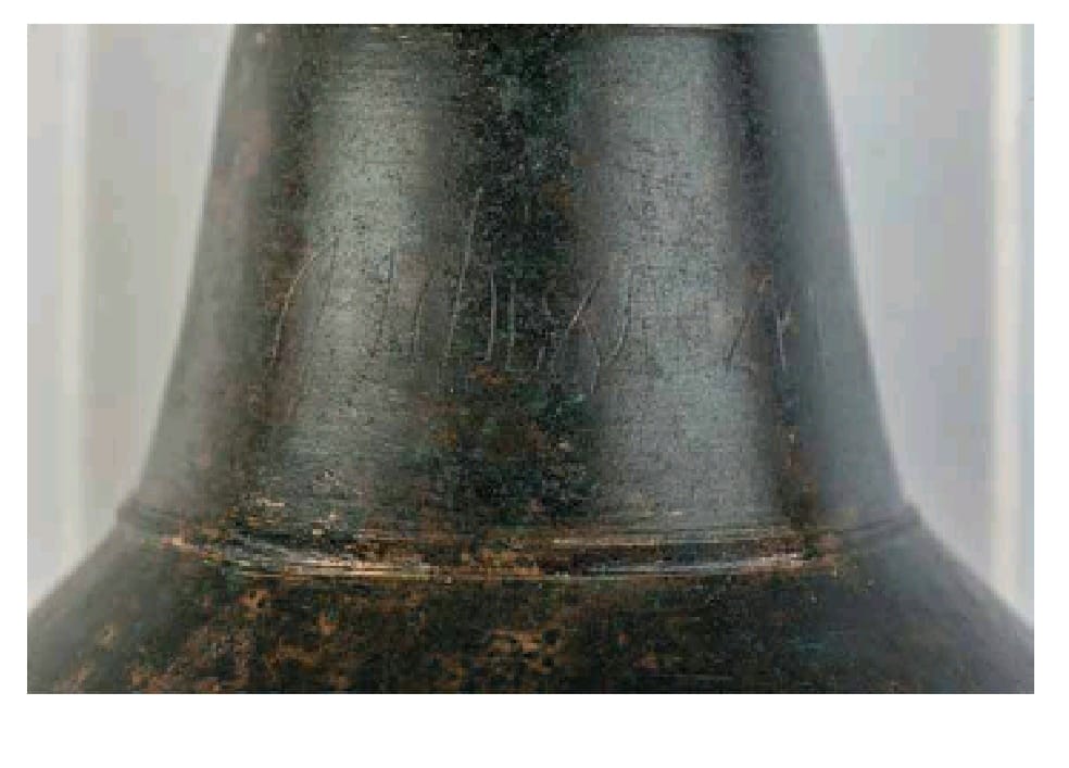 Posebnu vrijednost nalazu daje naknadno, relativno plitko i nevješto urezan natpis na uglatoj glagoljici. Čitljiv dio natpisa glasi „MARIE MATI BO(…)“, dok je završetak, za koji se pretpostavlja da je mogao glasiti „ŽIA“, danas nečitak zbog korozije. Opravdano se može pretpostaviti da je natpis izvorno zazivao Blaženu Djevicu Mariju kao Majku Božju.