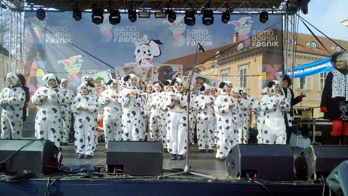 Na samom dolasku u Samobor dočekale su ih poznate fašničke maske – samoborska Sraka i Sudac. Program 191. Samoborskog fašnika započeo je u 10 sati ujutro nastupom svih gostujućih dječjih grupa. Na glavnoj pozornici članovi DND “Osmijeh” predstavili su svoju masku uz plesnu koreografiju. Ove godine bili su zamaskirani u njima drage likove iz crtića 101 Dalmatinac.
