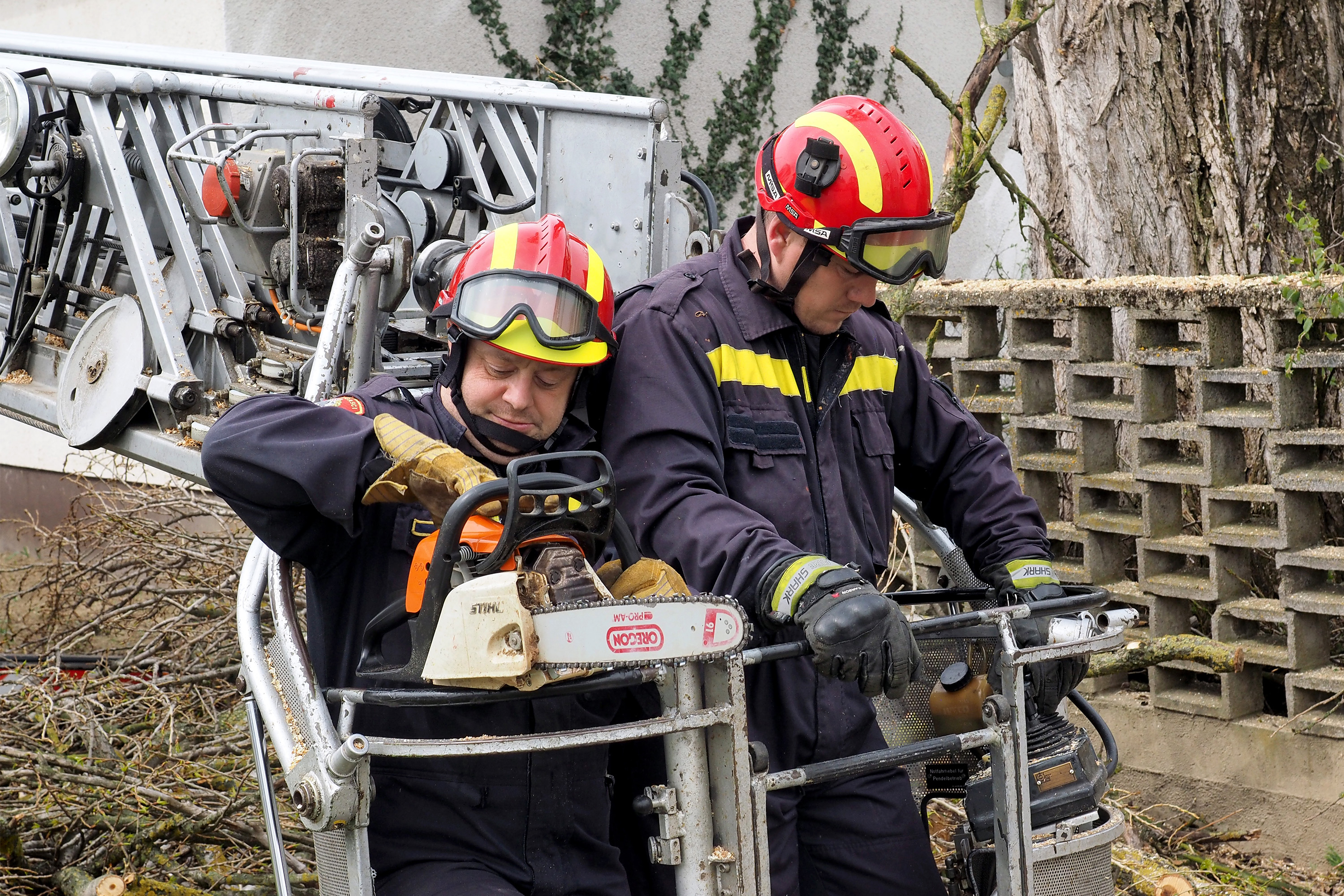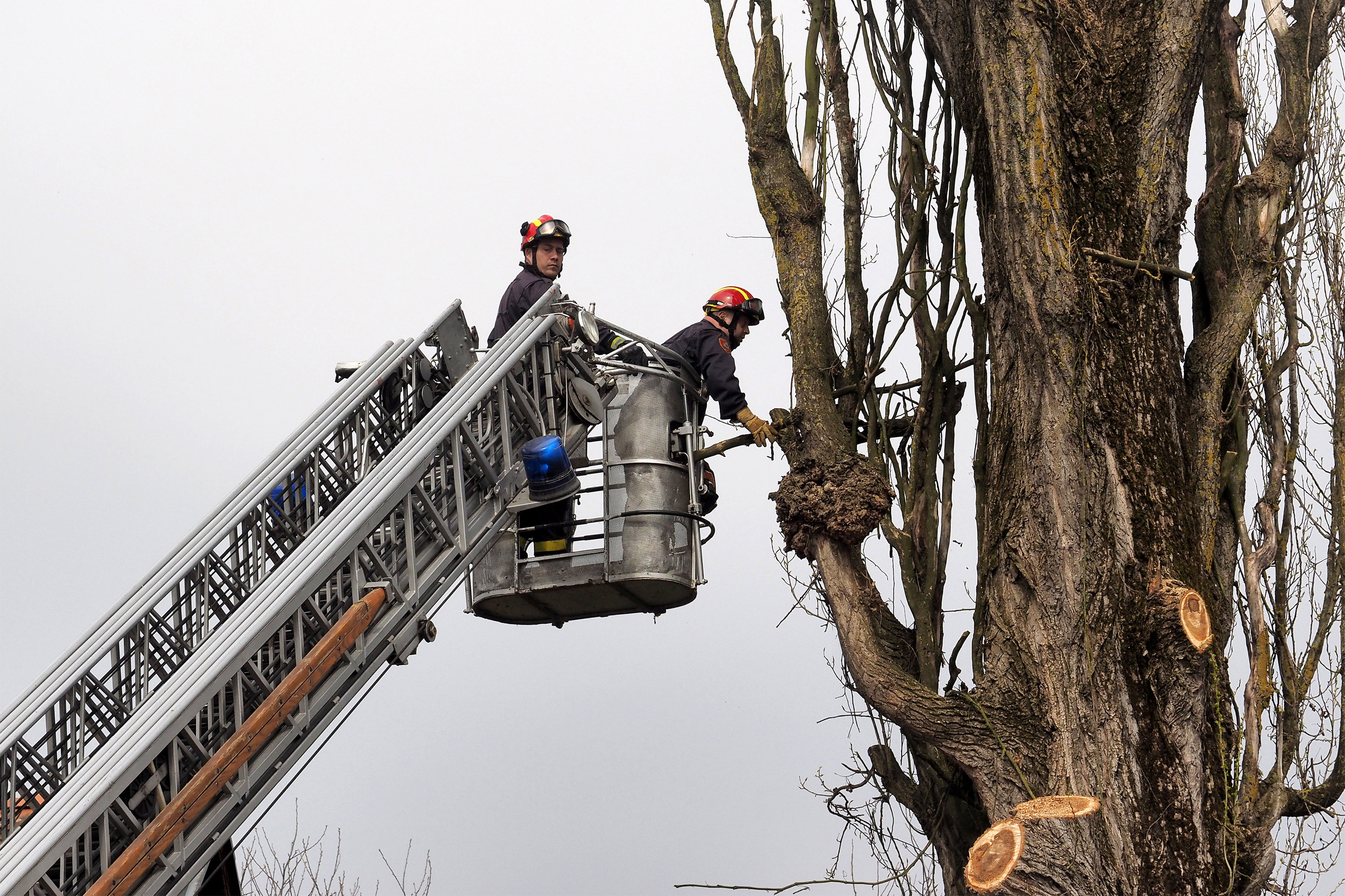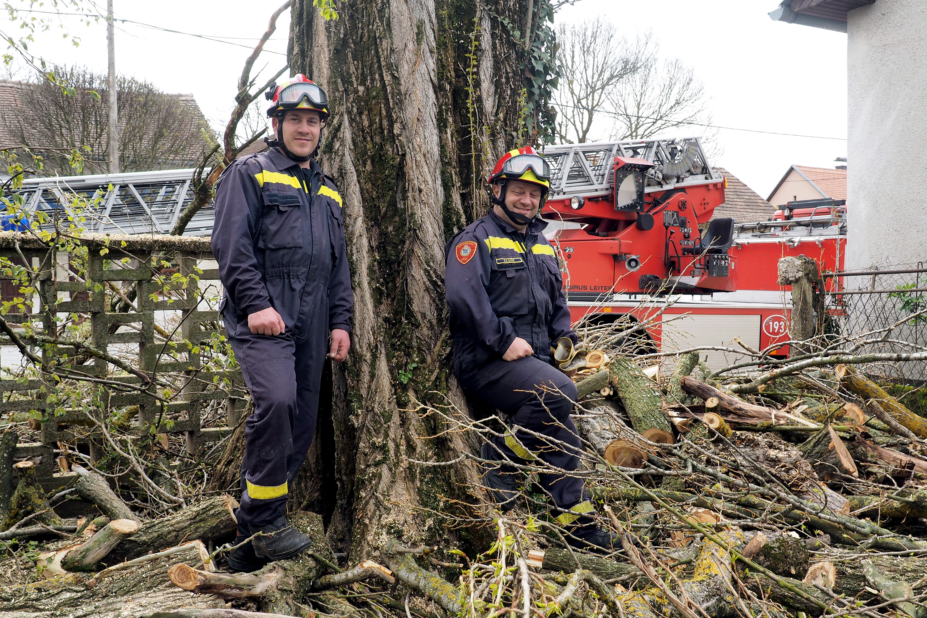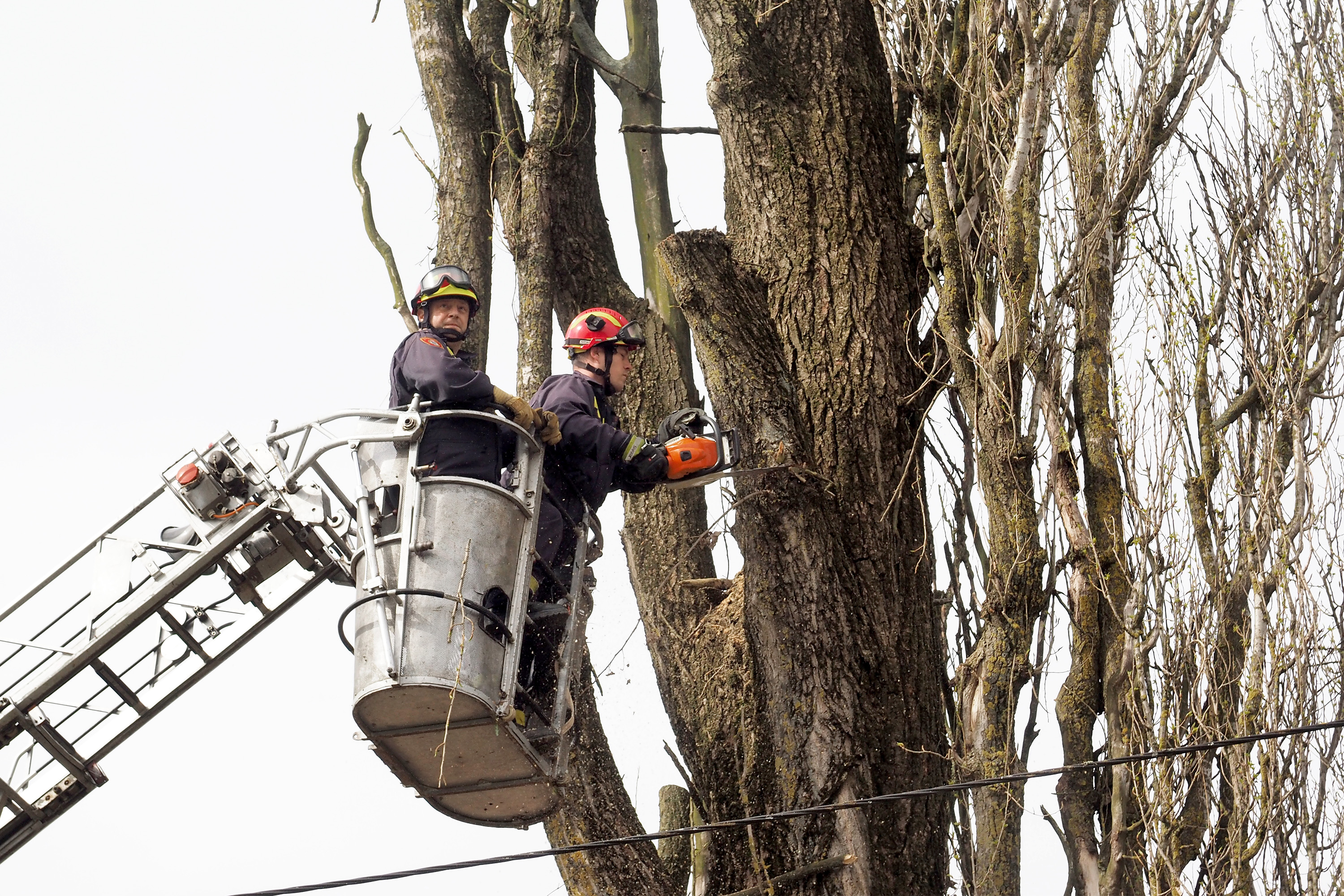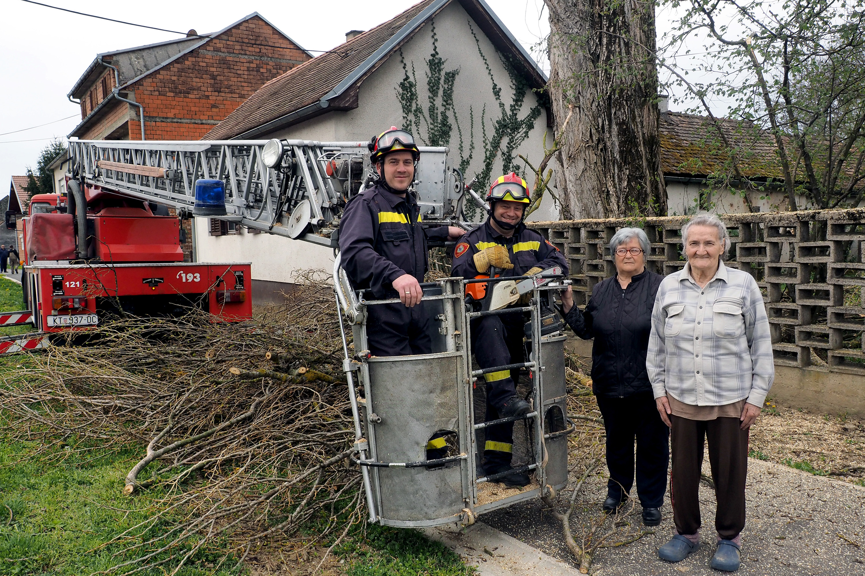 Susjeda Zdenka Hajdinović pozvala je vatrogasce i od srijede Goran Bezenšek, zapovjednik DVD Novska, i Vedran Lazić, vatrogasac, motornom pilom započeli su rezati grane. Iz košare vatrogasnih pomičnih ljestvi, zbog blizine obiteljskih kuća, strujnih i telefonskih kablova, kao i prometnica, oprezno uklanjaju dio po dio grana.