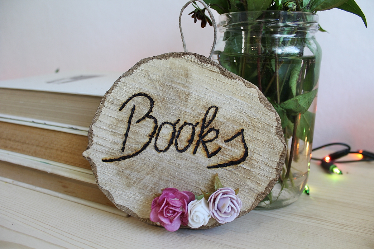 Ukrase sam prije nekoliko tjedana ugledala na “do-it-yourself“, “uradi sam” stranicama u potrazi za novim idejama kod uređenja životnog prostora. Polako, onoliko koliko mi vrijeme dopusti, preuređujem kuću i volim sama napraviti sitnice koje svemu daju poseban ugođaj. Tako sam ovaj put odlučila izraditi drveni ukras s natpisom “books” (engl. knjige), jer volim knjige i čitanje, a i odlično će mi se uklopiti u prostor. Vi možete napisati što god vas veseli, nešto što volite, zalijepiti papir s najdražim citatom ili samo nalijepiti ukrase.